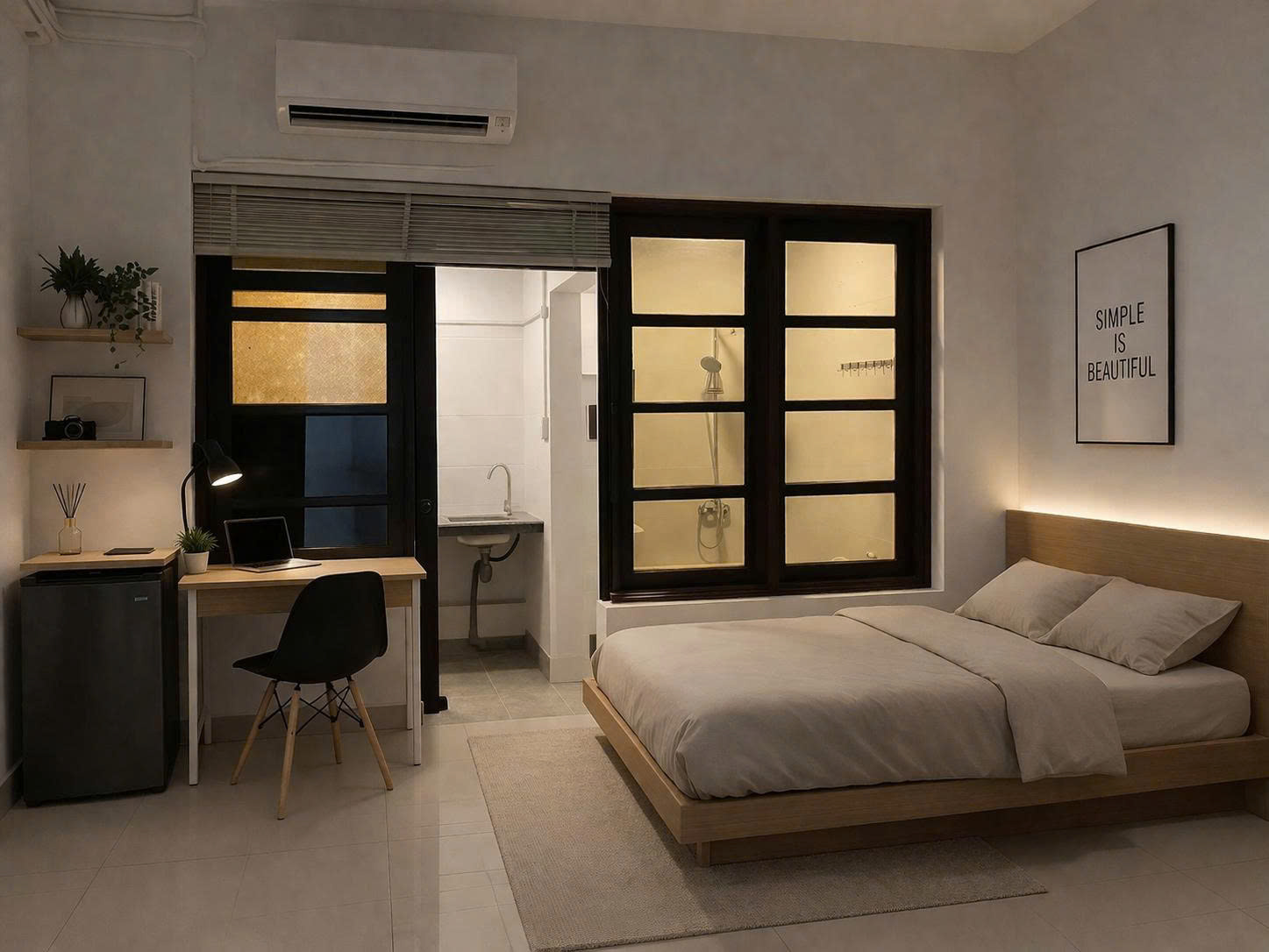 Full nội thất: giường, nệm, tủ, bàn làm việc, máy lạnh, nước nóng,… chỉ xách vali vào ở